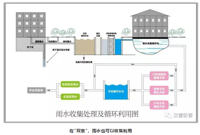 “雙童”建立了雨水收集系統(tǒng),通過在屋頂、路面、綠化中做好雨水收集點,每年能為“雙童”收集到5—6萬噸的雨水!這些雨水在經(jīng)過科學(xué)過濾后,可以作為消防用水、車間模具冷卻用水、生活區(qū)用水,直接產(chǎn)生經(jīng)濟(jì)效益近40多萬元。