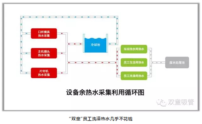 另外,公司考慮到能源節(jié)約和排放的控制,實施了設(shè)備余熱水循環(huán)系統(tǒng)以及設(shè)備余熱采集系統(tǒng)。設(shè)備余熱水循環(huán)系統(tǒng)通過對車間內(nèi)所有經(jīng)過模具的50度溫水進(jìn)行收集,處理之后供應(yīng)到所有寢室衛(wèi)生間給員工洗澡洗衣生活之用,從而高效利用了余熱能源。