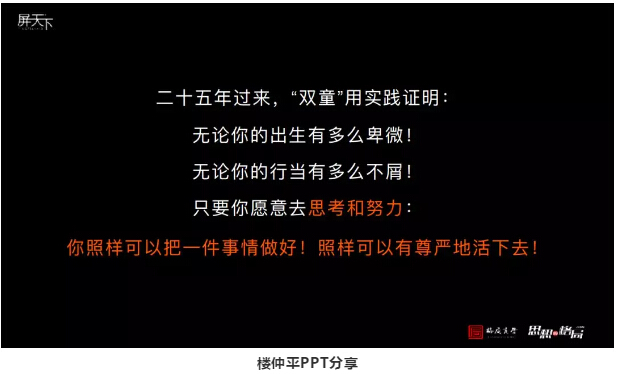因此,樓仲平引導(dǎo)企業(yè)主們:如果你的企業(yè)還很小、很卑微,一定不要對(duì)自己失去信心,要理解商業(yè)的積累。無(wú)論你的行業(yè)有多小,只要你意愿思考和努力,努力代表認(rèn)真,但前提在于思考。從各個(gè)角度去思考,認(rèn)真的去履行,是可以改變命運(yùn)的,改變?nèi)魏嗡^“不好”的產(chǎn)業(yè),所謂的“不好”并不存在。“做什么”并不重要,重要的是“怎么做”!