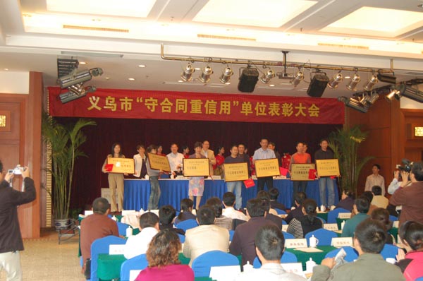 2007年10月18日上午辦公室主任盧程航代表公司參加義烏市“守合同重信用”單位表彰大會,義烏市政府副市長季金甫、義烏市工商局邱增法局長、工商局陸立權(quán)、洪金有、龔淑娟副局長等領(lǐng)導(dǎo)參加了會議。