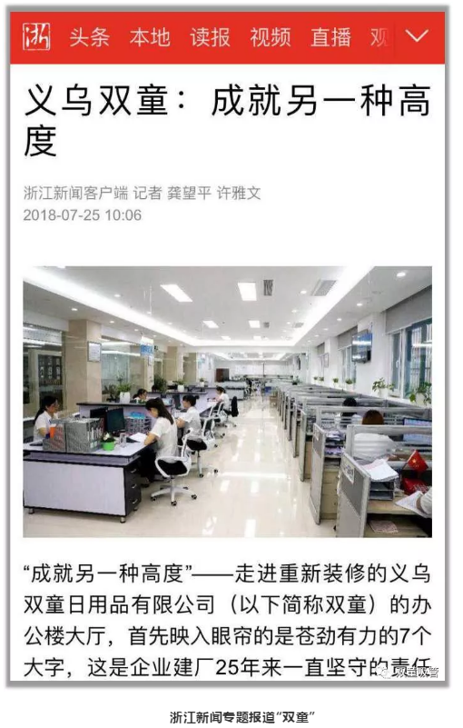 “成就另一種高度”——走進(jìn)重新裝修的義烏雙童日用品有限公司(以下簡(jiǎn)稱“雙童”)的辦公樓大廳,首先映入眼簾的是蒼勁有力的7個(gè)大字,這是企業(yè)建廠25年來(lái)一直堅(jiān)守的責(zé)任和使命。