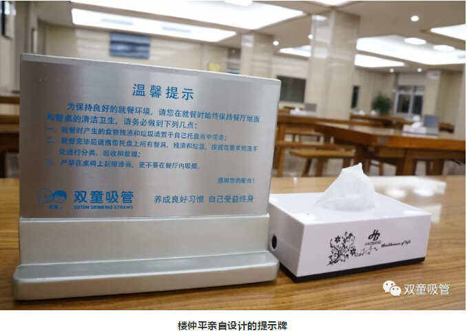 食堂餐桌上,擺放著樓仲平親自設(shè)計(jì)的提示牌,標(biāo)注的文字并不“可愛”:用餐者把食物殘?jiān)胖迷谕斜P中;用餐完畢后,在洗手處把碗具和餐后垃圾分類投放;嚴(yán)禁在桌椅上涂鴉。