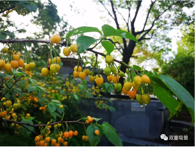最初成熟的就是櫻桃了,由青轉黃,由黃轉橙,最后變成紅色,一團團一簇簇如紅寶石一般掛在枝頭,好不誘人!