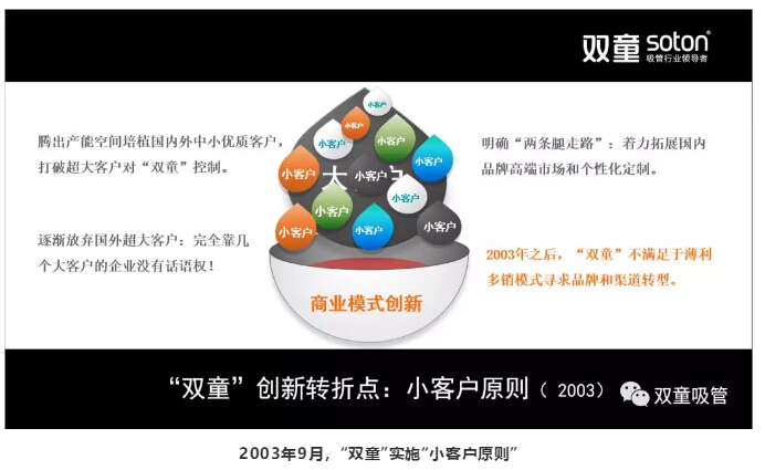 2003年9月,“雙童”實(shí)施“小客戶原則”,通過商業(yè)模式改革,改變了原來薄利多銷的粗放經(jīng)營(yíng)模式,通過獨(dú)樹一幟的銷售創(chuàng)新形成差異化錯(cuò)位競(jìng)爭(zhēng),逐漸遠(yuǎn)離同行之間惡性競(jìng)爭(zhēng),在持續(xù)積累下獲得全球吸管產(chǎn)業(yè)話語(yǔ)權(quán)和規(guī)則制定權(quán)。