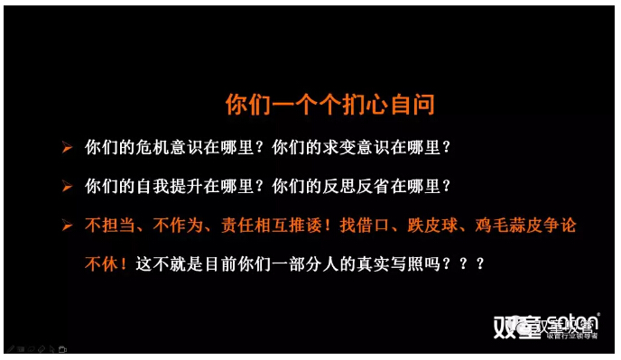 “雙童”樓仲平圍繞《危機(jī)重重下“雙童”路在何方?——“向死而生”我們只有六個(gè)月!》主題,通過兩個(gè)多小時(shí)的深入分享,讓行政員工們意識(shí)到“雙童”目前存在的嚴(yán)重問題,引導(dǎo)大家認(rèn)識(shí)自我、反思批判,打開思想的缺口!