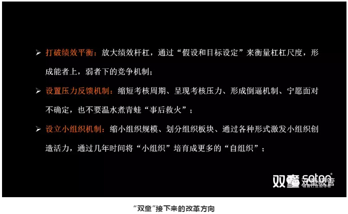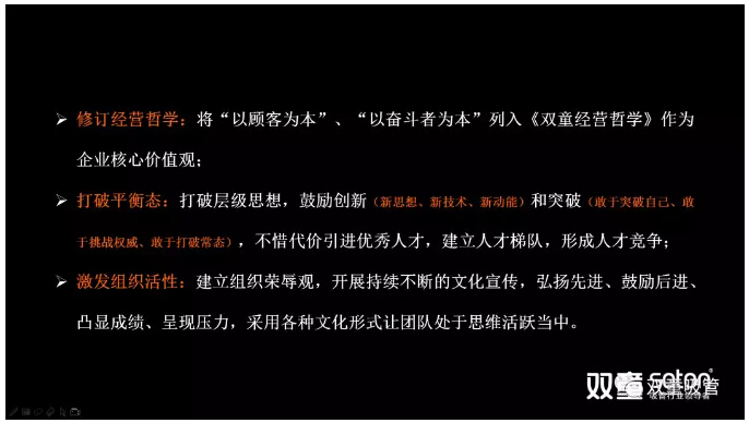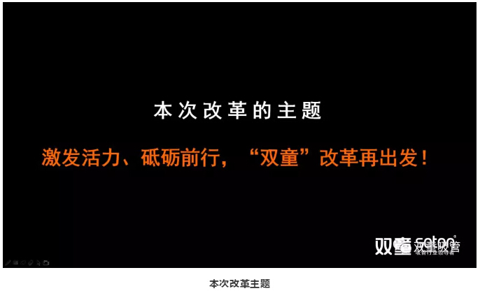 8月16日,當(dāng)家人樓仲平分享“雙童”改革反思篇《“向死而生”,“雙童”只有六個(gè)月!》,引導(dǎo)員工們自我反省,激發(fā)組織活力;8月17日,“雙童”總經(jīng)理李二橋分享改革篇《激發(fā)活力、砥礪前行》,分享“雙童”的改革方向;8月18日—19日,開展改革方案預(yù)案討論會(huì),所有管理層圍繞改革進(jìn)行深度思考和探討。