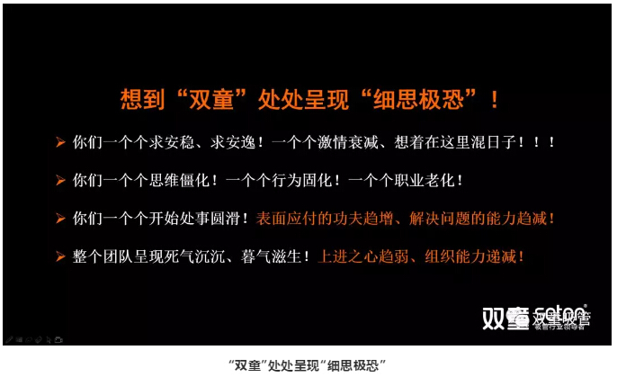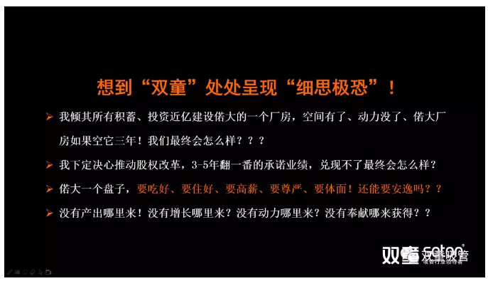 或許,大家覺得“雙童”發(fā)展的很好,為什么會(huì)“死”?為什么離“死亡”只有六個(gè)月?為什么時(shí)隔七年(2011年,“雙童”推動(dòng)經(jīng)理人再造重大變革)再次推動(dòng)企業(yè)重大改革?