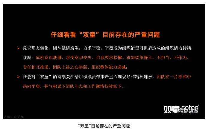 本次改革早在幾個(gè)月前,樓仲平就組織管理層進(jìn)行深度反思,對(duì)“雙童”近幾年工作進(jìn)行總結(jié)梳理,找出“雙童”近三年以來存在的問題,比如: