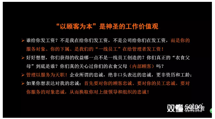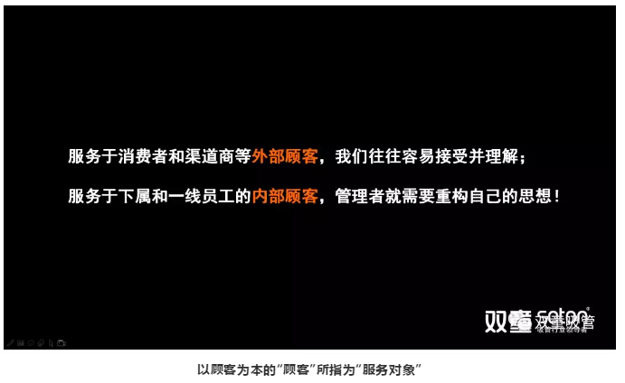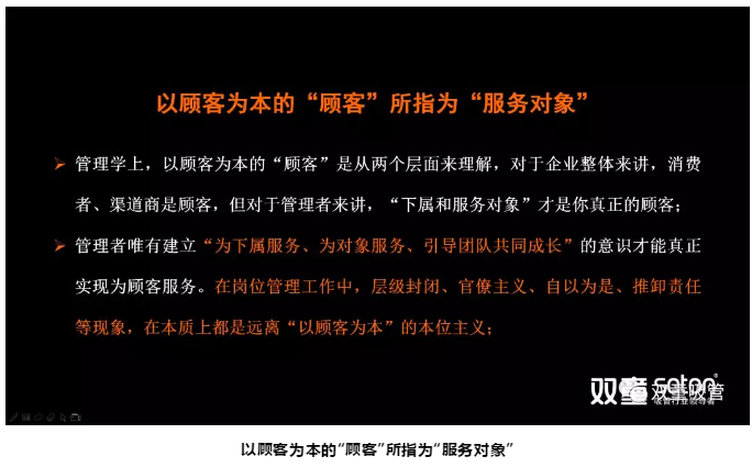 管理學(xué)上,以顧客為本的“顧客”所指為“服務(wù)對(duì)象”。對(duì)于企業(yè)整體來講,消費(fèi)者、渠道商是顧客,但對(duì)于管理者來講,“下屬和服務(wù)對(duì)象”才是你真正的顧客,一線員工才是你真正的顧客。給你發(fā)工資的不是老板,而是你的下屬,你的服務(wù)對(duì)象,是我們的“一線員工”在給管理者發(fā)工資!
