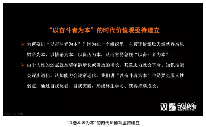 為什么要以“奮斗者為本”?由于人性的弱點(diǎn)就是隨年齡增長(zhǎng)或資歷的增長(zhǎng),其意志力就會(huì)下降、知識(shí)技能會(huì)逐步退化、認(rèn)知能力會(huì)逐漸老化,我們講“以?shī)^斗者為本”也是要克服人性弱點(diǎn),通過自我反省、自我突破,形成終生學(xué)習(xí)、獲得持續(xù)成長(zhǎng)!