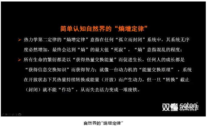 “熵增定律”意指在任何“孤立而封閉”系統(tǒng)中,其系統(tǒng)無序度必然增加,最終會(huì)達(dá)到“熵”的最大值“死寂”。任何一個(gè)人,任何一個(gè)組織,乃至于任何一個(gè)家庭,如果你把自己封閉起來,你的內(nèi)部一定是從有序到無序。如果你繼續(xù)封閉,它的混亂程度一定會(huì)達(dá)到最大值,一直到死寂。