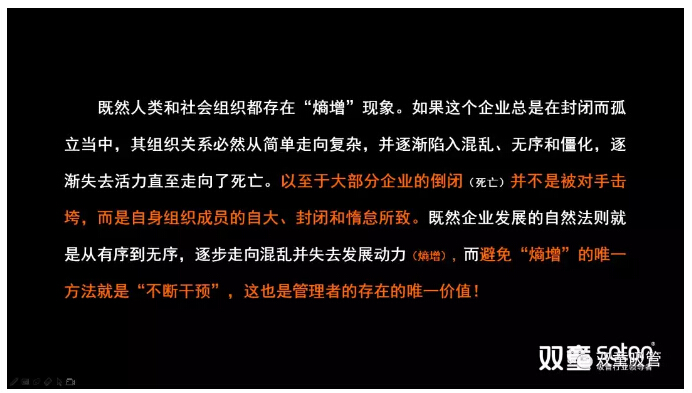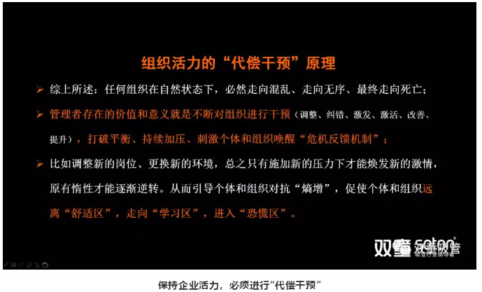 而避免“熵增”的唯一方法就是持續(xù)開放和組織干預(yù),從而打破平衡,持續(xù)加壓、刺激個(gè)體和組織喚醒“危機(jī)反饋機(jī)制”,這也是管理者的存在的唯一價(jià)值!