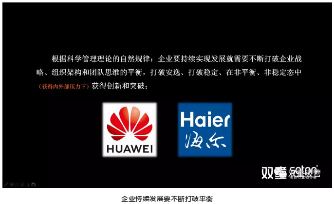 接下來,樓仲平用華為及海爾的案例,引導(dǎo)大家認(rèn)知:企業(yè)要持續(xù)實(shí)現(xiàn)發(fā)展就需要不斷打破企業(yè)戰(zhàn)略、組織架構(gòu)和團(tuán)隊(duì)思維的平衡,打破安逸、打破穩(wěn)定、在非平衡、非穩(wěn)定態(tài)中(獲得內(nèi)外部壓力下)獲得創(chuàng)新和突破!