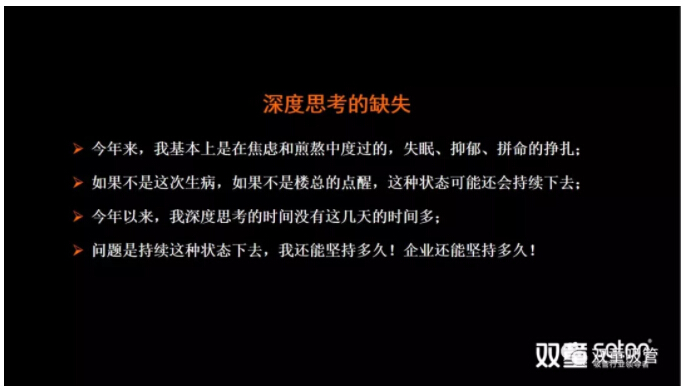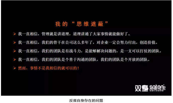 1自我反思:我是怎么了?首先,總經(jīng)理李二橋就自己存在的問題進行了反思:“我缺乏深度思考,存在著思維遮蔽。今年以來,我一直像救火隊長一樣,不停地在救火,不停地陷入到具體事務當中,從而無法集中精力來深度思考企業(yè)管理方面的問題?!?/span>