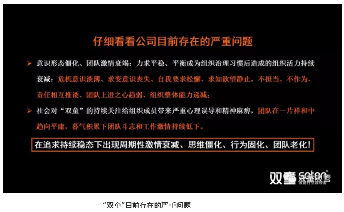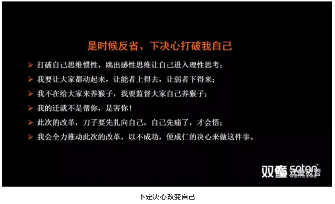 “所以是時候反省,并下決心打破自己!打破自己的思維慣性,跳出感性思維進入理性思考,勇于突破和改變自我,下定決心再次推動‘雙童’改革?!?/span>