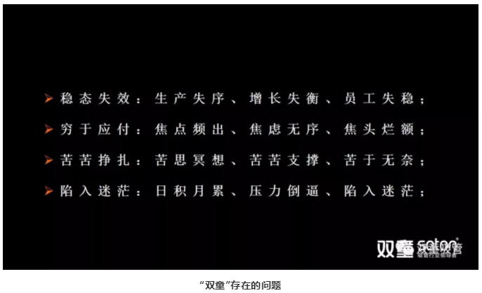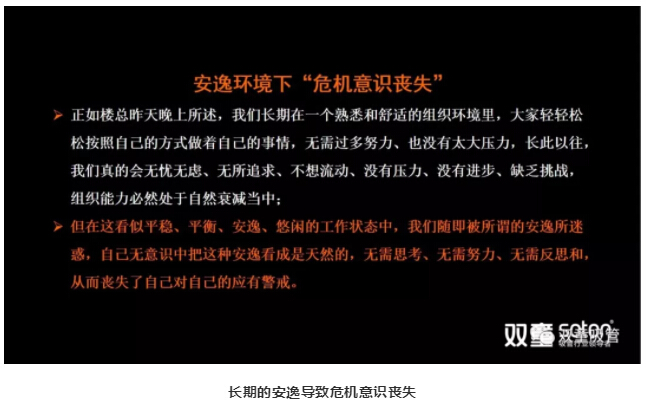 由于社會環(huán)境的復雜性、時代的巨變性和企業(yè)的自然墮變性,當家人樓仲平意識到“雙童” 直面“生死劫”!隨即通過“向死而生”的命題假設(shè),讓團隊認知到雙童離“死亡”只有六個月,以此激發(fā)員工的危機感,從而讓“雙童”管理層再次脫離“舒適區(qū)”,遠離“危險區(qū)”,進入“恐慌區(qū)”!通過對“死”的反悟,激發(fā)組織活力,從而得以延續(xù)獲得“生”的能力。