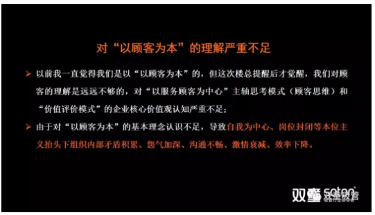 近些年來,“雙童”人沒有形成“以服務顧客為中心”的主軸思考模式,對顧客思維的認知嚴重不足。導致以自我為中心、崗位封閉的情況存在,從而使得組織內(nèi)部矛盾越積越深。
