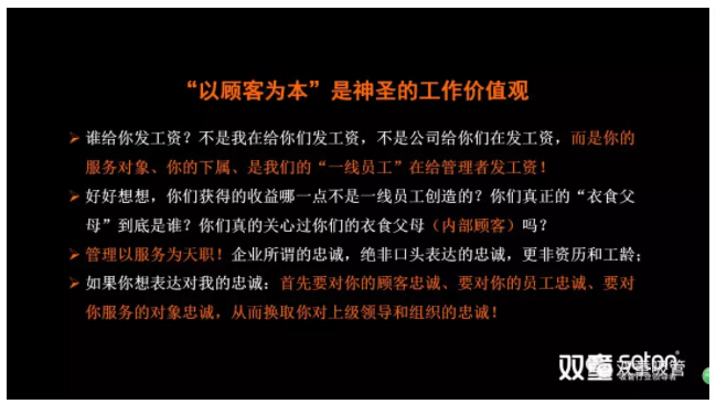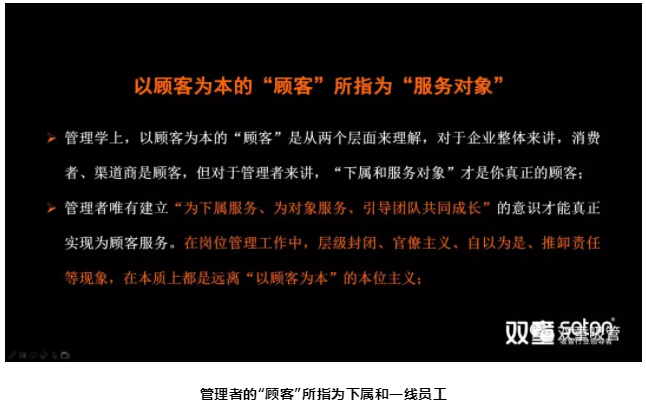 管理學上,以顧客為本的“顧客”所指為“服務對象”。對于企業(yè)整體來講,消費者、渠道商是顧客,但對于管理者來講,“下屬和服務對象”才是你真正的顧客,一線員工才是你真正的顧客。給你發(fā)工資的不是老板,而是你的下屬,你的服務對象,是我們的“一線員工”在給管理者發(fā)工資!