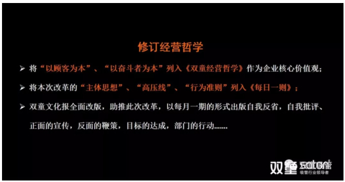 “以顧客為本”、“以奮斗者為本”、“管理者以一線員工為本”列入《雙童經(jīng)營哲學》作為企業(yè)核心價值觀; 將本次改革的“主體思想”、“高壓線”、“行為準則”列入《每日一則》; 雙童文化報全面改版,助推此次改革,以每月一期的形式出版自我反省,自我批評、正面的宣傳,反面的鞭策,目標的達成,部門的行動…….