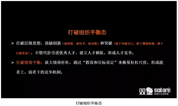 打破層級思想,鼓勵創(chuàng)新(新思想、新技術(shù)、新動能)和突破(敢于突破自己、敢于挑戰(zhàn)權(quán)威、敢于打破常態(tài)),不惜代價引進優(yōu)秀人才,建立人才梯隊,形成人才競爭; 打破績效平衡:放大績效桿杠,通過“假設(shè)和目標設(shè)定”來衡量杠杠尺度,形成能者上,弱者下的競爭機制;