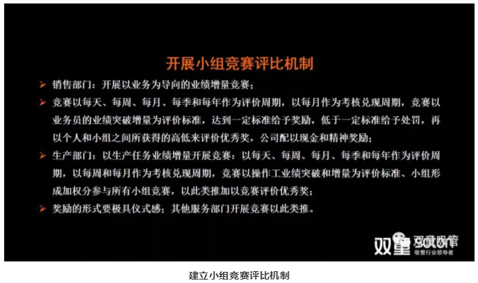 銷售部門:以業(yè)務為導向的業(yè)績增量競賽;競賽以每天、每周、每月、每季和每年作為評價周期,以每月作為考核兌現(xiàn)周期,競賽以業(yè)務員的業(yè)績突破增量為評價標準,達到一定標準給予獎勵,低于一定標準給予處罰,再以個人和小組之間所獲得的高低來評價優(yōu)秀獎,公司配以現(xiàn)金和精神獎勵; 生產(chǎn)部門:以生產(chǎn)任務業(yè)績增量開展競賽;以每天、每周、每月、每季和每年作為評價周期,以每周和每月作為考核兌現(xiàn)周期,競賽以操作工業(yè)績突破和增量為評價標準、小組形成加權(quán)分參與所有小組競賽,以此類推加以競賽評價優(yōu)秀獎;獎勵的形式要極具儀式感;其他服務部門開展競賽以此類推。