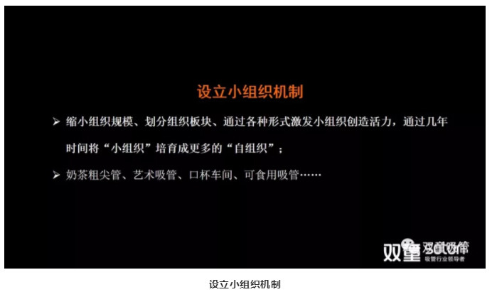 縮小組織規(guī)模、劃分組織板塊、通過各種形式激發(fā)小組織創(chuàng)造活力,通過幾年時間將“小組織”培育成更多的“自組織”。