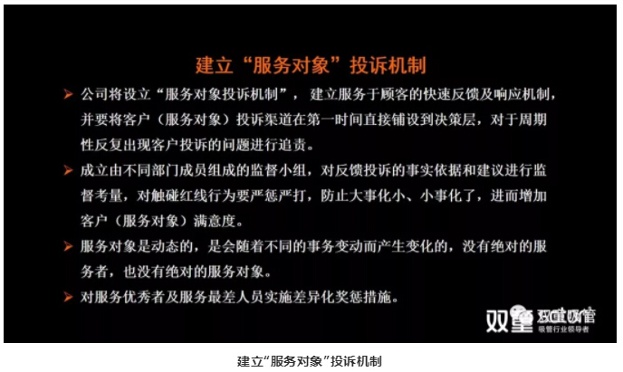 公司將設(shè)立“服務對象投訴機制”, 建立服務于顧客的快速反饋及響應機制,并要將客戶(服務對象)投訴渠道在第一時間直接鋪設(shè)到?jīng)Q策層,對于周期性反復出現(xiàn)客戶投訴的問題進行追責。 成立由不同部門成員組成的監(jiān)督小組,對反饋投訴的事實依據(jù)和建議進行監(jiān)督考量,對觸碰紅線行為要嚴懲嚴打,防止大事化小、小事化了,進而增加客戶(服務對象)滿意度。 服務對象是動態(tài)的,是會隨著不同的事務變動而產(chǎn)生變化的,沒有絕對的服務者,也沒有絕對的服務對象。對服務優(yōu)秀者及服務最差人員實施差異化獎懲措施。