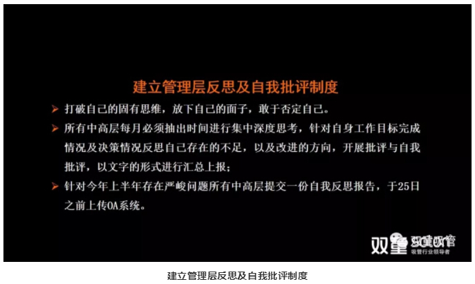 打破自己的固有思維,放下自己的面子,敢于否定自己。 所有中高層每月必須抽出時間進行集中深度思考,針對自身工作目標完成情況及決策情況反思自己存在的不足,以及改進的方向,開展批評與自我批評,以文字的形式進行匯總上報; 針對今年上半年存在嚴峻問題所有中高層提交一份自我反思報告,于25日之前上傳OA系統(tǒng)。
