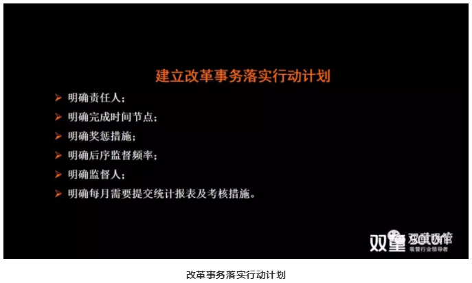 “雙童”將建立起改革事務落實行動計劃,明確各項指標,并定立相應的考核措施,要求所有人每月將報表上交財務,直接與工資掛鉤,確保每個人都行動起來,確保改革事務貫徹落實。