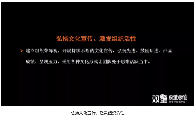 建立組織榮辱觀,開展持續(xù)不斷的文化宣傳,弘揚先進、鼓勵后進、凸顯成績、呈現(xiàn)壓力,采用各種文化形式讓團隊處于思維活躍當中。