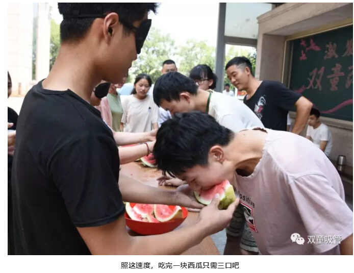 兩人一組,一個(gè)蒙眼喂西瓜,一個(gè)吃西瓜,聽起來十分簡單,但也看雙方的配合是否默契?,F(xiàn)場相互比拼的緊張氣氛,看得所有人都倒吸一口氣!不過,這位童鞋可真賣力!