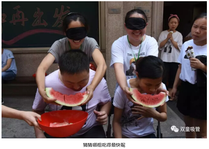 游戲的第一項(xiàng)就是“蒙眼吃西瓜”!聽到吃,大家的眼睛都亮了,笑說:吃西瓜,太簡單了!真的像大家說的很簡單嗎?快跟著妞來看看吧!