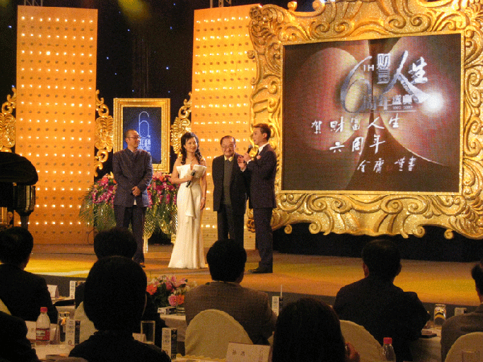 上圖為慶典晚會現(xiàn)場,金庸大俠(圖右二)在接受主持人葉蓉(圖左二)、康輝(圖右)的采訪,金庸大俠的精彩演講為晚會增添無窮樂趣。