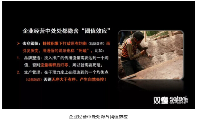 首先,引導(dǎo)大家理解企業(yè)經(jīng)營當(dāng)中處處都隱含著閾值效應(yīng),而閾值擊穿,就是持續(xù)積累下打破原有均衡(邊際效應(yīng))而引發(fā)質(zhì)變,用通俗的說法也稱“死磕”。