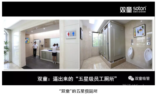 受此影響,2003年“雙童”在建設(shè)廠房后,就將所有公共洗手間全部按“五星級”的標(biāo)準(zhǔn)進(jìn)行裝修。因為,一個企業(yè)的洗手間最能體現(xiàn)企業(yè)的經(jīng)營理念,所以要生產(chǎn)出優(yōu)質(zhì)的產(chǎn)品,洗手間就應(yīng)該是企業(yè)最干凈的地方。