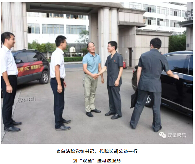 9月9日下午,在“70法官服務(wù)70+企業(yè),打造最佳營(yíng)商環(huán)境”活動(dòng)的啟動(dòng)儀式后,義烏法院黨組書(shū)記、代院長(zhǎng)胡公益帶領(lǐng)蘇溪法庭、知識(shí)產(chǎn)權(quán)庭、辦公室等部門(mén)負(fù)責(zé)人第一時(shí)間到達(dá)“雙童”,了解企業(yè)在生產(chǎn)經(jīng)營(yíng)過(guò)程中的司法需求及送司法服務(wù)。