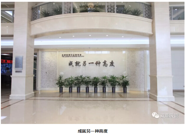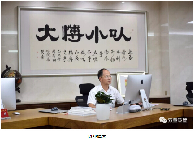 “雙童”樓仲平辦公桌后面的四個(gè)大字“以小博大”和“雙童”行政大廳的“成就另一種高度”連起來(lái)就是“雙童”的座右銘。