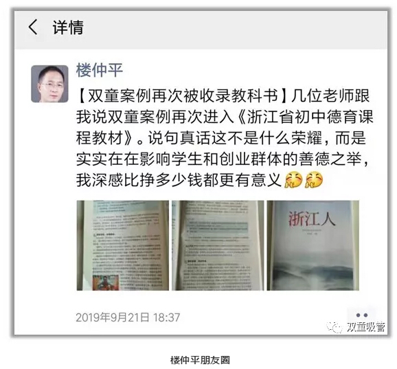 號(hào)外!號(hào)外!“雙童”案例再次被收錄教科書!近日,幾位老師告訴當(dāng)家人樓仲平,“雙童”案例出現(xiàn)在浙江省初中德育課程教材《浙江人》當(dāng)中,樓仲平也第一時(shí)間在朋友圈中分享了這個(gè)好消息,并感言:這比掙多少錢都有意義!