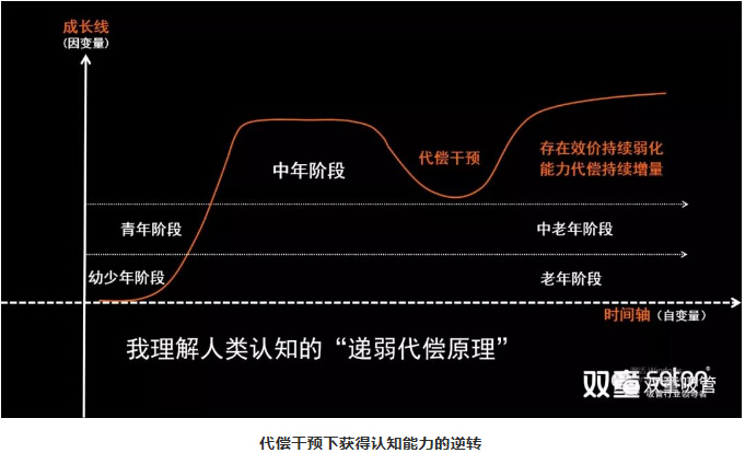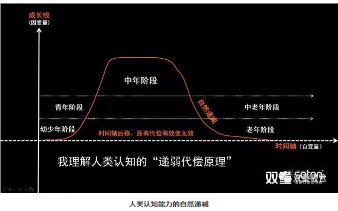 所以,我用一個“認(rèn)知能力”思維模型給大家說明:人類發(fā)展中的成長性是能夠無窮拓展的。比如正常來講,看一個人的認(rèn)知能力,從幼年、少年、青年,到中年處于一個鼎盛階段,到中老年階段之后就進(jìn)入到自然遞減的過程。