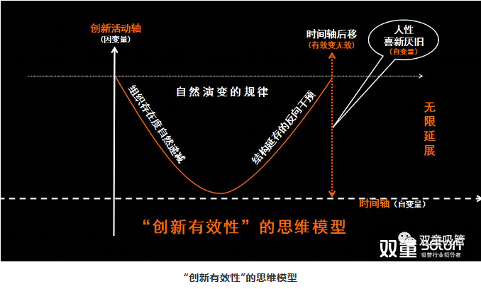 由此可以推導(dǎo)出,創(chuàng)新是創(chuàng)業(yè)活動的前提,是不得不為之的“生存干預(yù)”。在這個干預(yù)過程當(dāng)中大家要理解,它某種程度上是滿足人性的底層,它有一個不變的規(guī)律就是在時間軸后移的情況下創(chuàng)新有效變無效,所以創(chuàng)新是一個無限延展的過程。