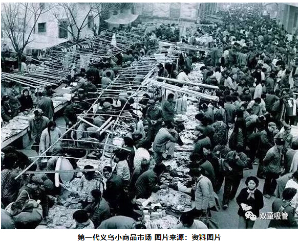 兩年后,樓仲平建議父親去城里“雞毛換糖”,城里人多,能掙的錢也多。到了江西景德鎮(zhèn)之后,他們發(fā)現(xiàn)菜市場(chǎng)門口有人鋪了一塊塑料布,上面放著義烏的小百貨在賣。后來(lái),他和父親也從義烏進(jìn)了一批小百貨,放到菜市場(chǎng)門口賣。直到1982年,義烏提出興商建市的發(fā)展戰(zhàn)略,建成了義烏第一代市場(chǎng)第一代市場(chǎng)——稠城市場(chǎng)正式開(kāi)業(yè),聚集起了700多個(gè)商戶,每家商戶拿一塊板,一塊塑料布就能開(kāi)店。