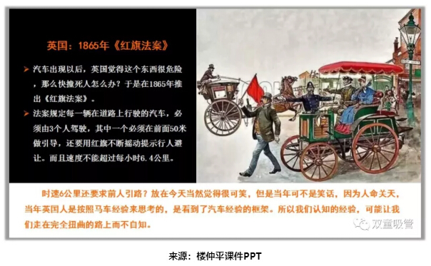 實際上,這就是“經(jīng)驗”在作祟。我們現(xiàn)代人之所以覺得《紅旗法案》很可笑,是建立在我們對如今汽車的認知經(jīng)驗上。而當(dāng)時的英國人則是建立在對當(dāng)時盛行的馬車的認知經(jīng)驗上。