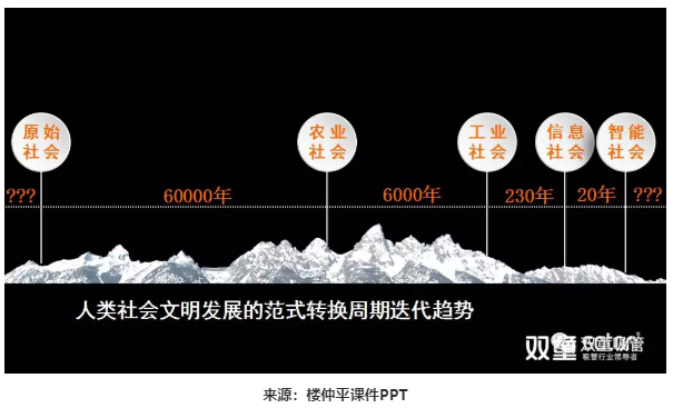 從這頁PPT中,我們可以看到,人類從原始社會過渡到農(nóng)業(yè)社會,經(jīng)歷了60000年;從農(nóng)業(yè)社會過渡到工業(yè)社會,經(jīng)歷了6000年;從工業(yè)社會過渡到信息社會,經(jīng)歷了230年;而從信息社會過渡到智能社會,人類僅僅需要20年。這說明在人類社會文明發(fā)展的過程中,范式轉(zhuǎn)換的周期變得越來越短。