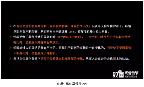 當(dāng)經(jīng)驗不變而事物不斷變化時,經(jīng)驗就成了絆腳石!因此,如果你在信息化社會還一直局限在以往的經(jīng)驗里面,就會忽視外部世界的變化,人云亦云,失去基本的認知,從而錯失了已經(jīng)發(fā)生的機會。