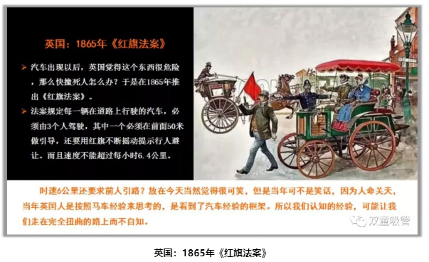 1865年,由于懼怕汽車速度過快撞到行人,英國議會出于安全考量通過了一部《機動車法案》,即后來被人嘲笑的《紅旗法案》。在這部法案中規(guī)定:每一輛在道路上行駛的機動車,必須由3個人駕駛,其中一個必須在車前面50米以外做引導(dǎo),還要用紅旗不斷搖動為機動車開道,并且速度不能超過每小時4英里(每小時6.4公里)。
