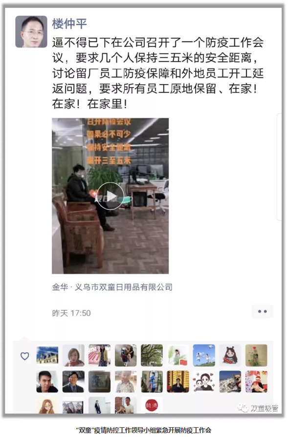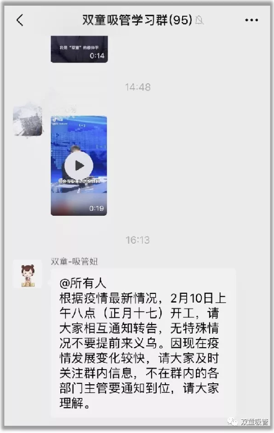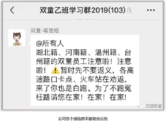 “雙童”微信群不斷發(fā)出公告,提醒所有員工延返義烏,何時(shí)回公司上班根據(jù)疫情控制而定,對(duì)于湖北籍員工,在家期間工資照發(fā),一分不扣,給員工們吃下了定心丸。