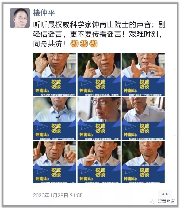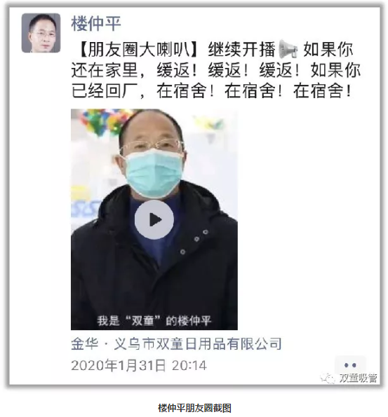 “雙童”樓仲平則當(dāng)起了朋友圈大喇叭,不斷提醒員工們緩返義烏,在家休息,不要輕信并傳播謠言。