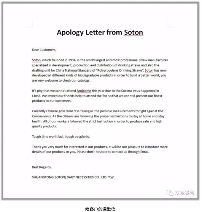 開展后,我們也遭遇了一大難題。由于中國(guó)疫情原因,客戶對(duì)中國(guó)館充滿顧慮,甚至不愿意走進(jìn)攤位中和業(yè)務(wù)員溝通。此時(shí),“雙童”團(tuán)隊(duì)寫了一封給客戶的道歉信(介紹雙童基本情況、不能親臨現(xiàn)場(chǎng)的原因),并粘貼客戶告知書(告知兩位業(yè)務(wù)員是長(zhǎng)期在德留學(xué)生,短期內(nèi)未回過(guò)中國(guó)),從而消除了客戶們的顧慮。