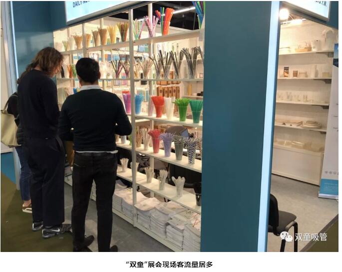 展會(huì)期間,盡管中國(guó)館的參展商不多,但每天都有絡(luò)繹不絕來(lái)自全球各地的參展商到“雙童”展位駐足洽談,對(duì)“雙童”的各類吸管、可降解材質(zhì)包裝盒等產(chǎn)品表示了濃厚的興趣。