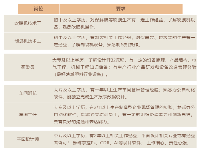 吹膜機(jī)技術(shù)工、制袋機(jī)技術(shù)工、研發(fā)員、